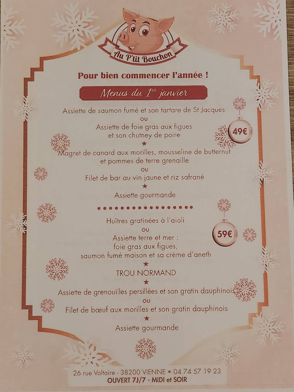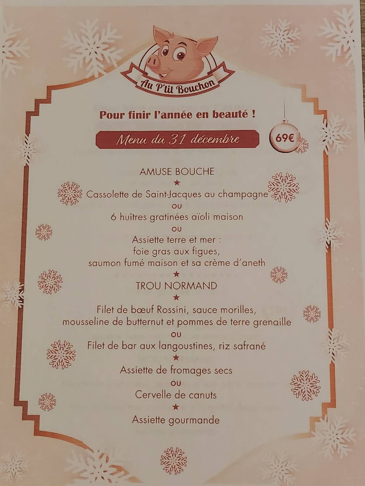 Le restaurant au P'tit Bouchon vous propose son menu du 31 Décembre au tarif de 69€ par personne.